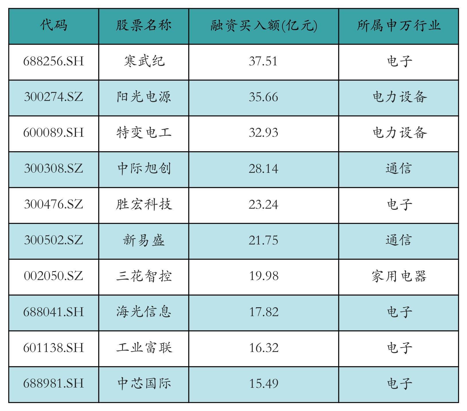 两市共有3456只个股有融资资金买入,其中寒武纪、阳光电源、特变电工排名前三,买入金额分别37.51亿元、35.66亿元、32.93亿元。融资买入额前10个股详情见下表:
