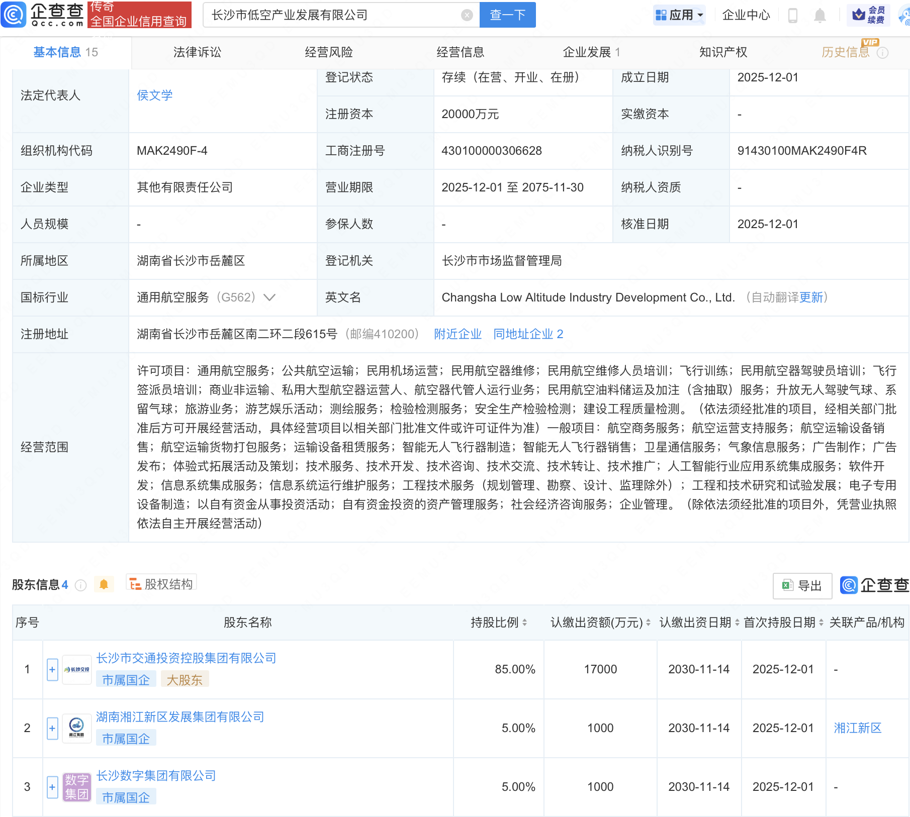近日信钰证券 ,长沙市低空产业发展有限公司成立,注册资本2亿元,经营范围包含:智能无人飞行器制造;智能无人飞行器销售;卫星通信服务;气象信息服务等。企查查股权穿透显示,该公司由长沙市交通投资控股集团有限公司等共同持股。